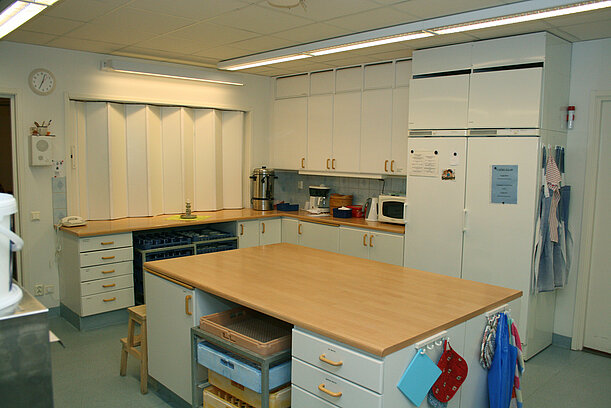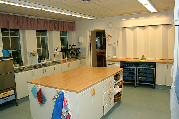 Köket är utrustat med 2 vanliga spisar med ugn, storköks-diskmaskin, köksö och avlastningsbänkar.